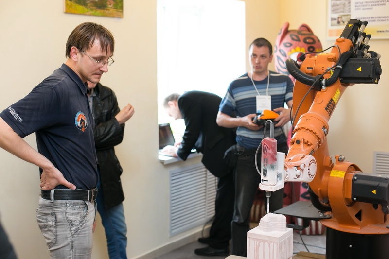 В ходе работы конференции на примере обработки сложной скульптуры были наглядно продемонстрированы методы программирования промышленных роботов, что стало возможным благодаря кооперации трех предприятий: ООО «Делкам-Самара», KUKA Robotics RUS и ООО «ТКП Фолипласт». Данный проект был выполнен под эгидой Международного симпозиума скульпторов, проходившего в это же время на базе отдыха «Чистые пруды». Скульптура «Диана» (автор – Летисия Де Базелер, Франция, Бронза, 2014 г.) была отсканирована оптическим сканером Artec (поставщик ООО «Делкам-Самара»), предоставленный Центром молодежного инновационного творчества (ЦМИТ) «Действуй» (г. Заречный). На основе сканированных 3D-данных были подготовлены два варианта технологии изготовления копии скульптуры: