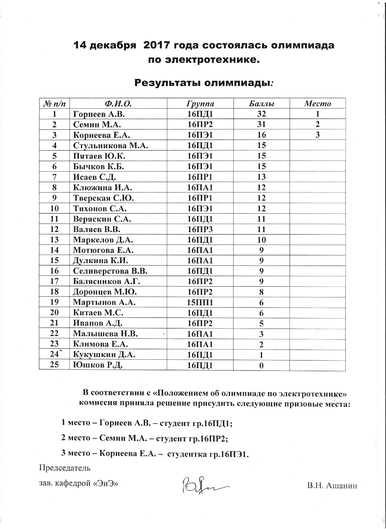 На кафедре «Электроэнергетика и электротехника» состоялась университетская олимпиада по электротехнике, в которой приняли участие студенты различных направлений подготовки Политехнического института. Все призовые места заняли студенты факультета приборостроения, информационных технологий и электроники. Первое место занял студент кафедры «НиМЭ» Антон Горнеев (группа 16ПД1); второе место присуждено Максиму Семину, студенту кафедры «РТиРЭС» (группа 16ПР2); третье место завоевала Екатерина Корнеева, студентка кафедры «ЭиЭ» (группа 16ПЭ1).