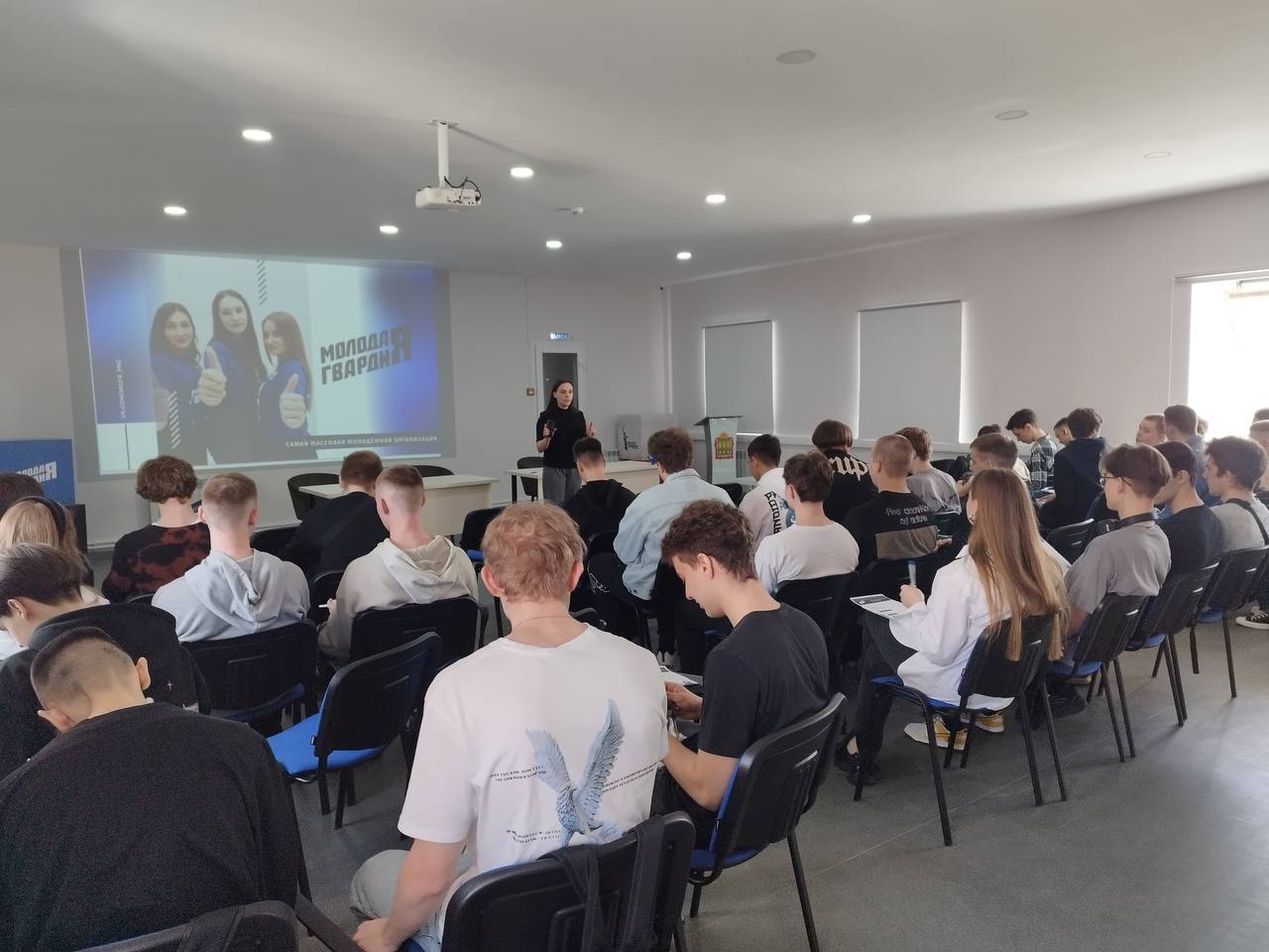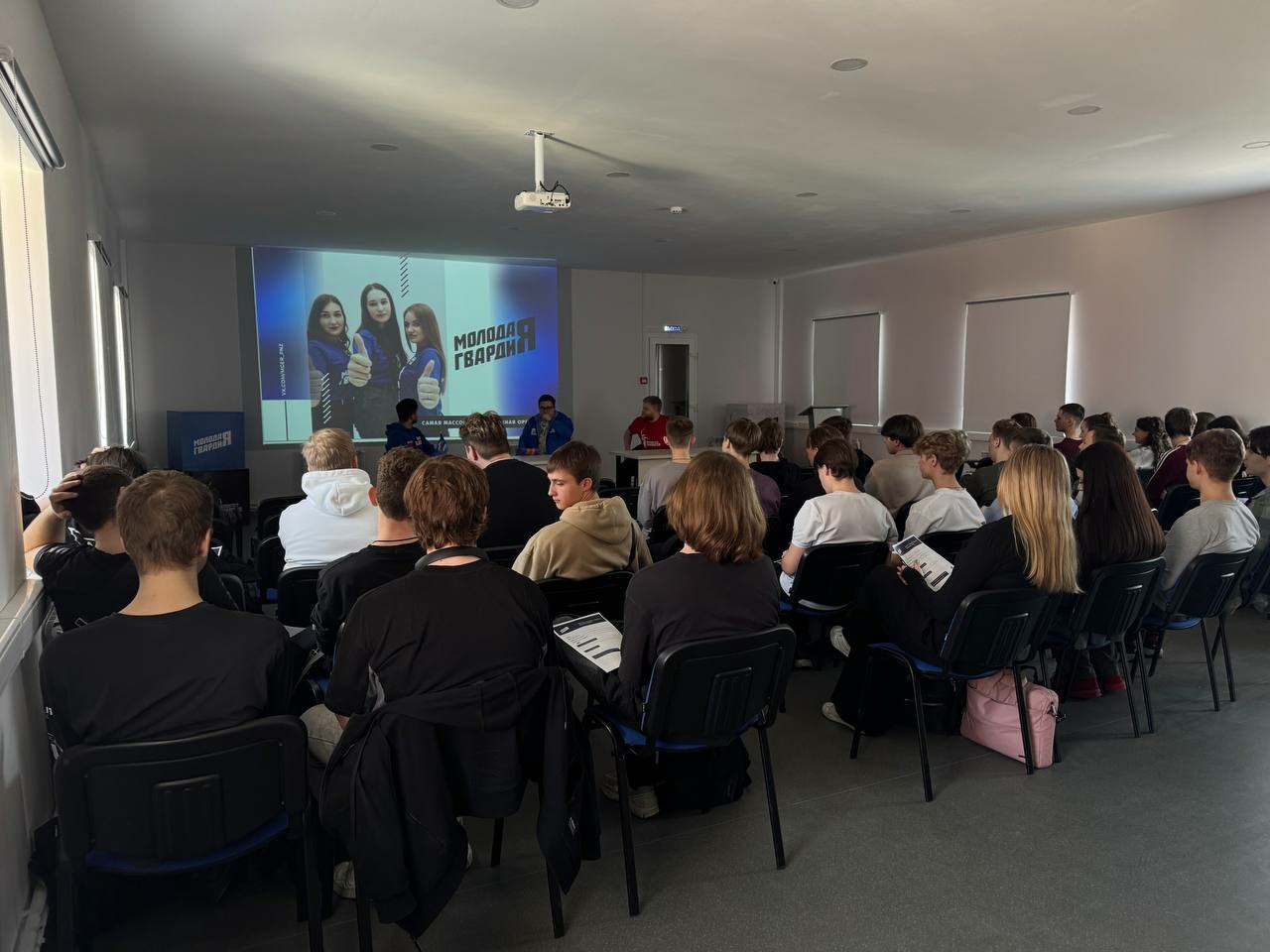 Активисты рассказали студентам 1-го курса ФВТ о деятельности «Молодой Гвардии», реализуемых общественных проектах и оказываемой поддержке новым регионам России. Ребята посмотрели видеоролики с форумов «Лидеры молодежи 58», «Центр подготовки волонтеров гуманитарных миссий» и других. Молодогвардейцы также представили отчетные видео с проведенных массовых патриотических акций.