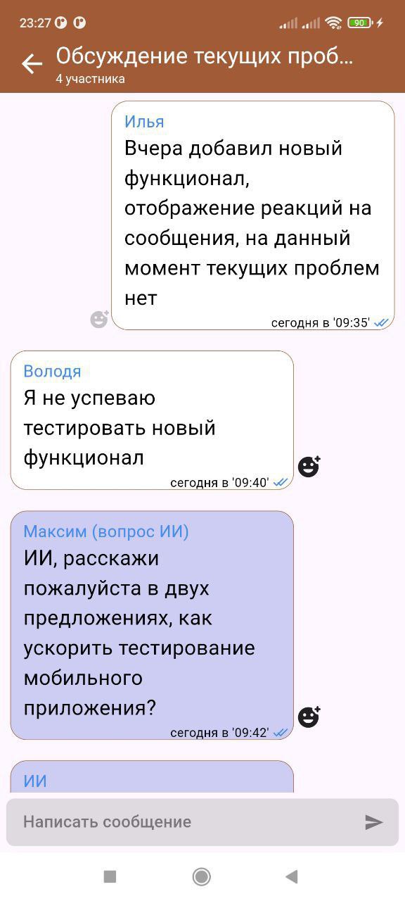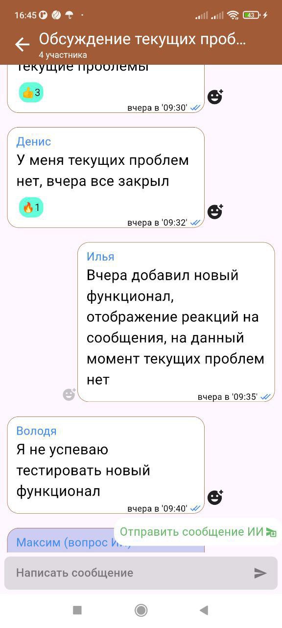 Прототип мессенджера с ИИ-ассистентом прошел первое тестирование. Весь функционал (запуск, авторизация, создание чата, обмен сообщениями, добавление реакций) работает.